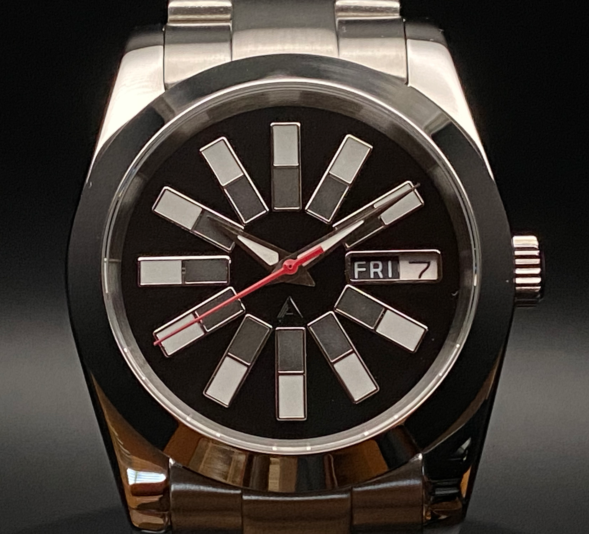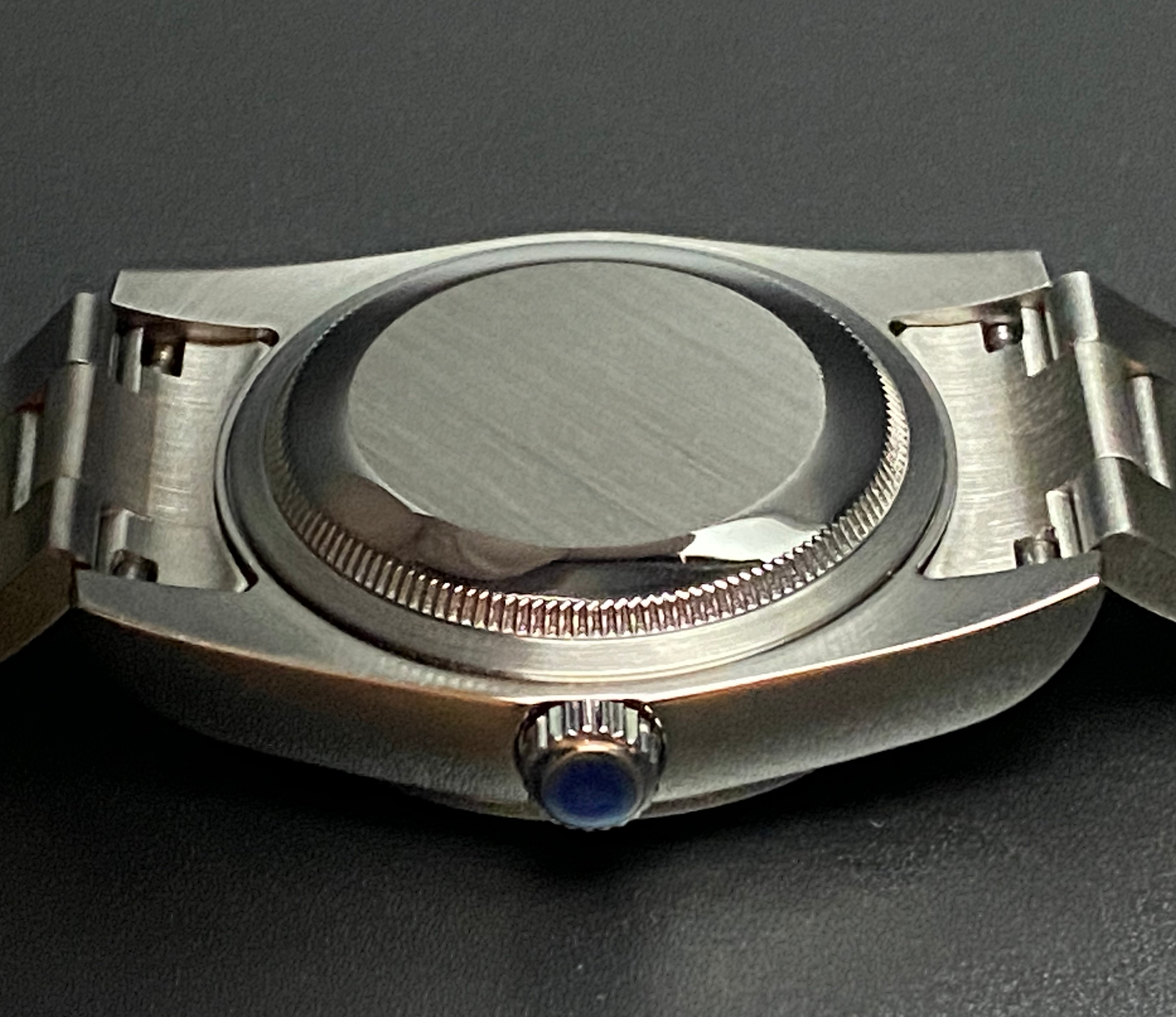 - Band: Brushed stainless steel Oyster-style.