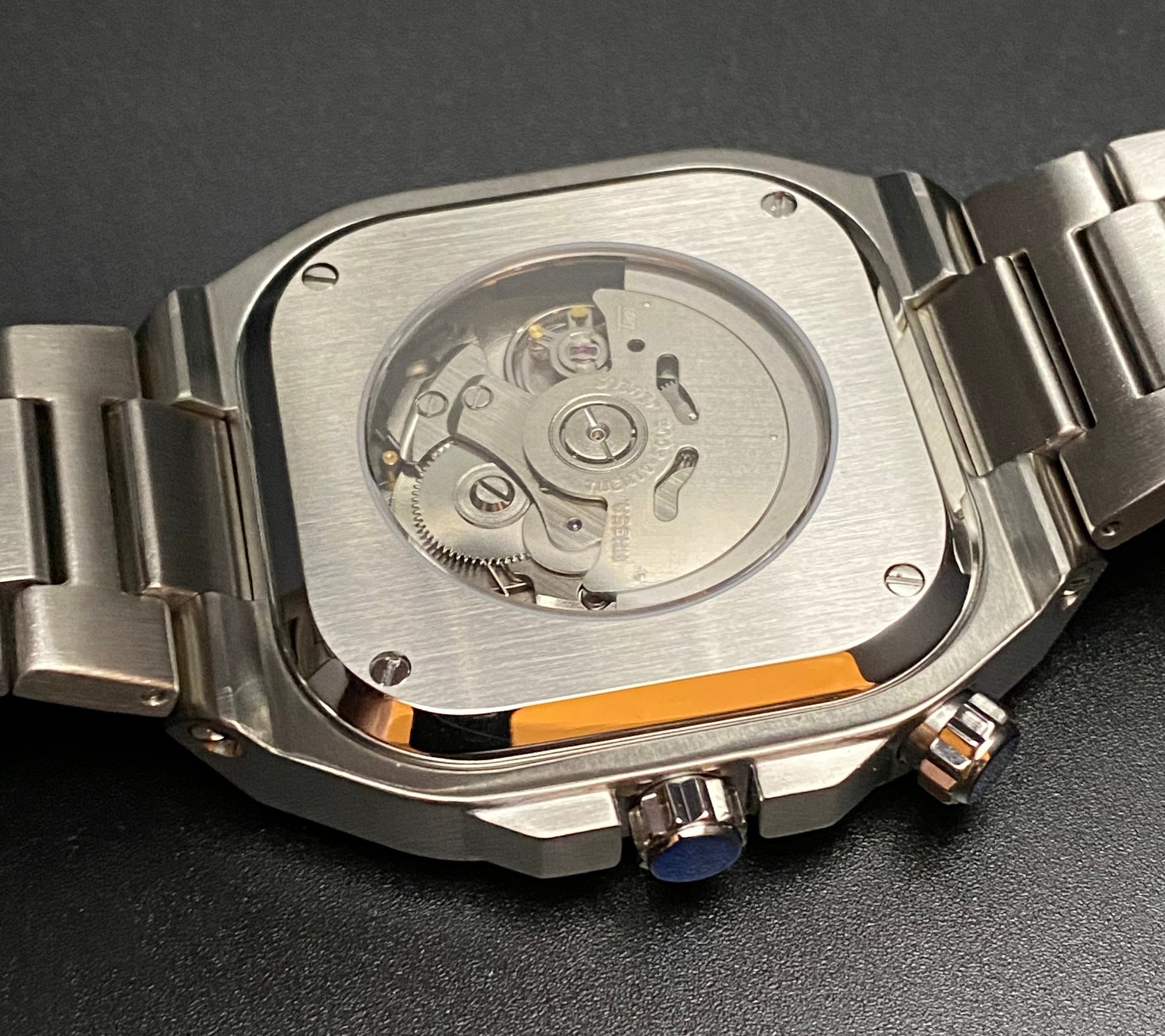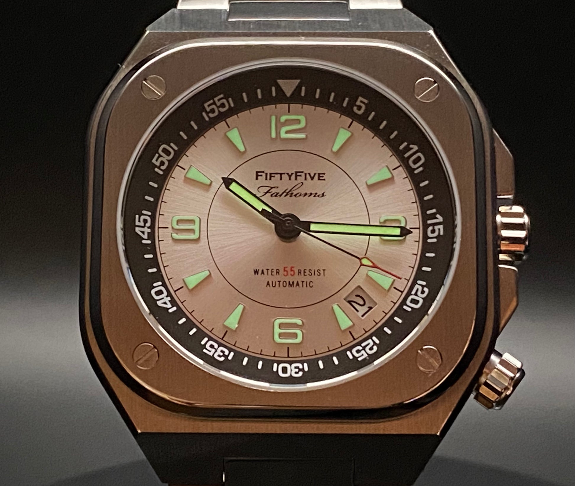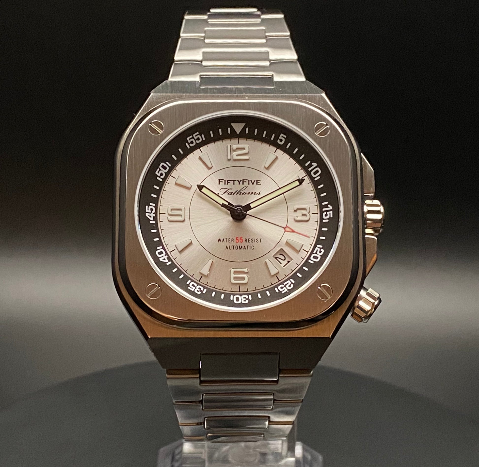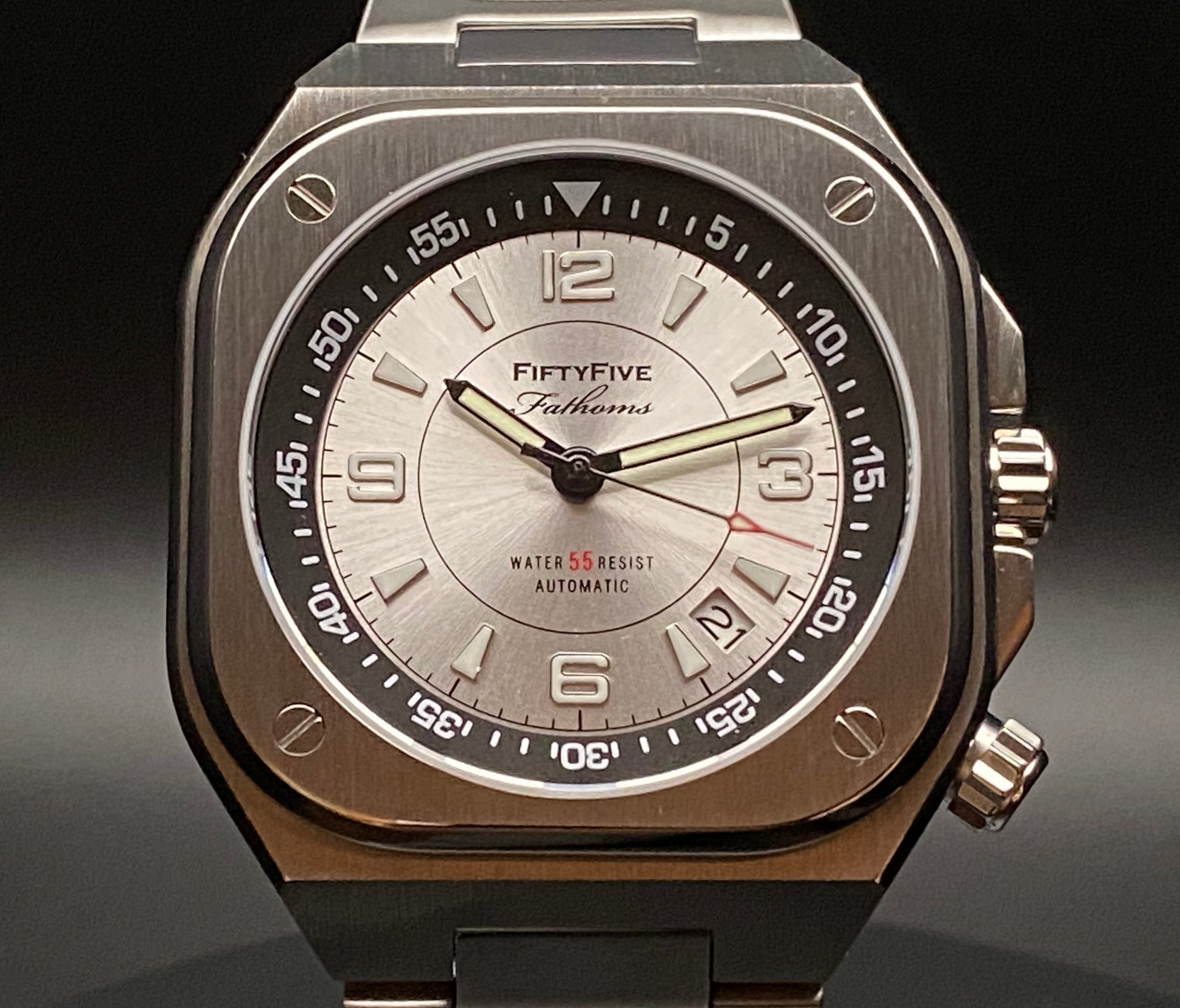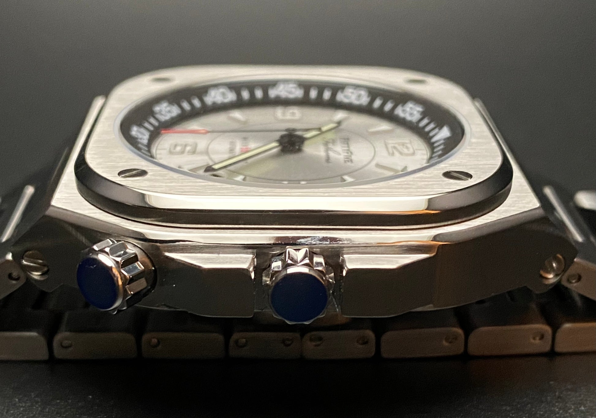 - Crown: Screw-down stainless steel. Second stainless steel crown at 4 o’clock controls internal bezel