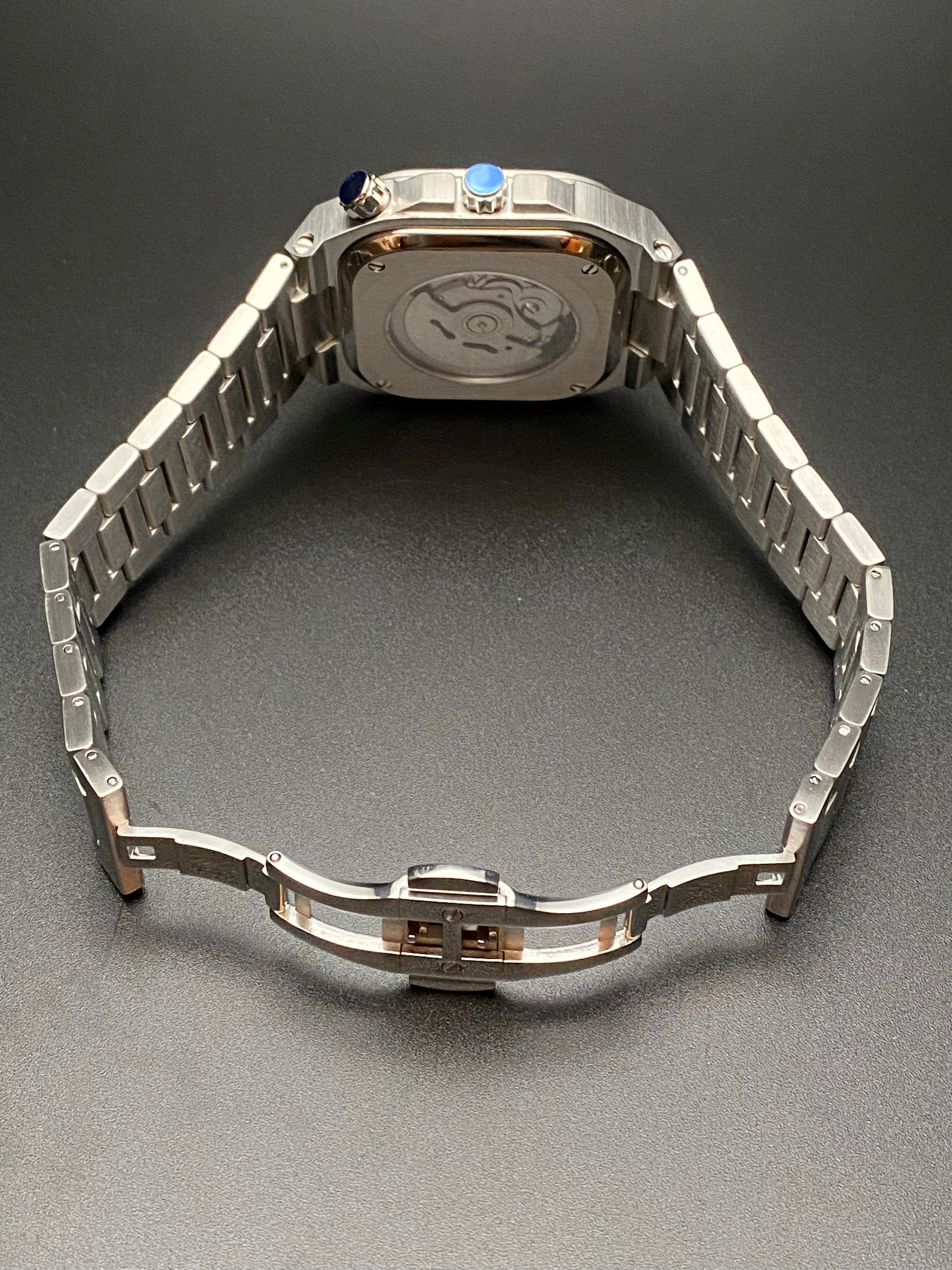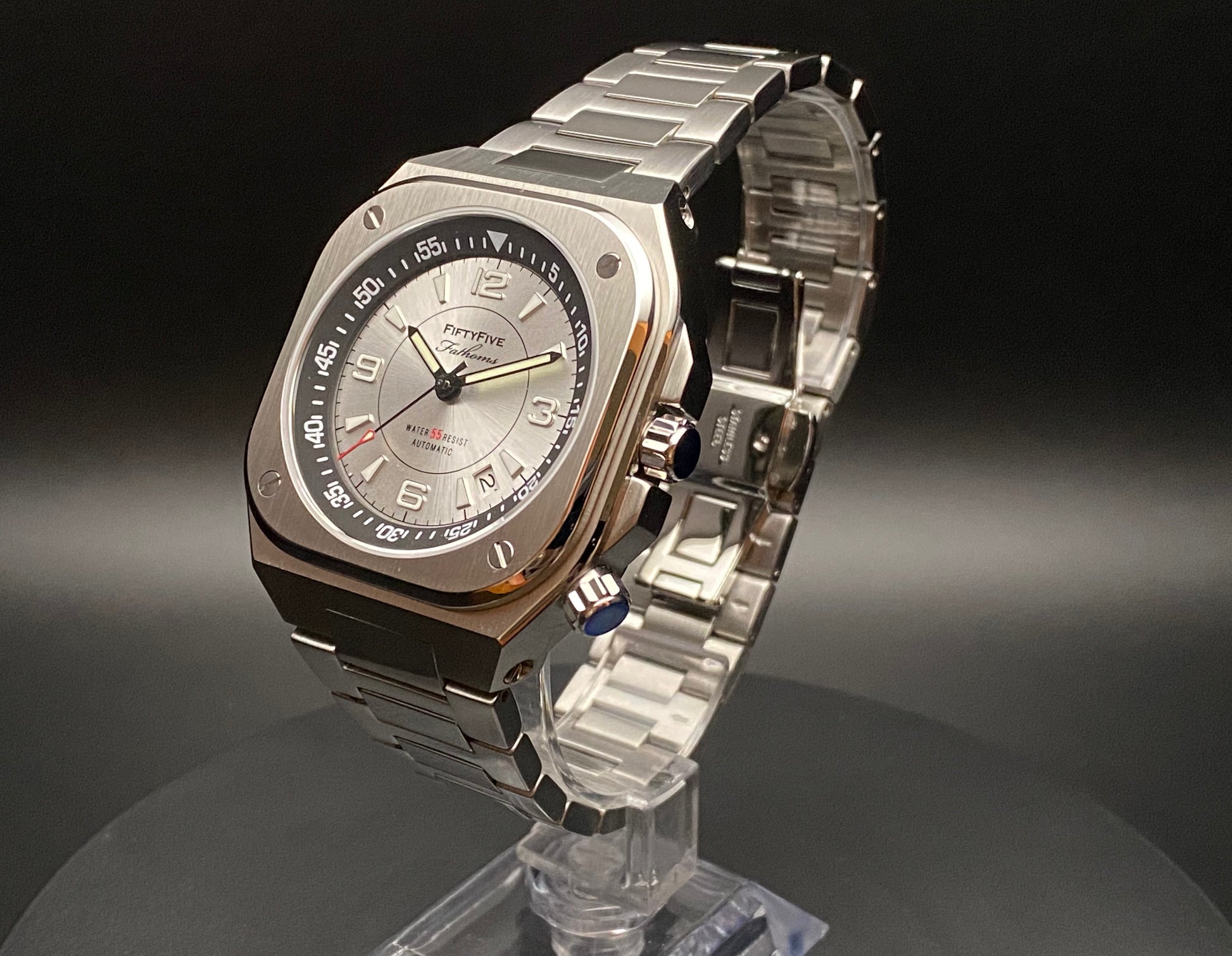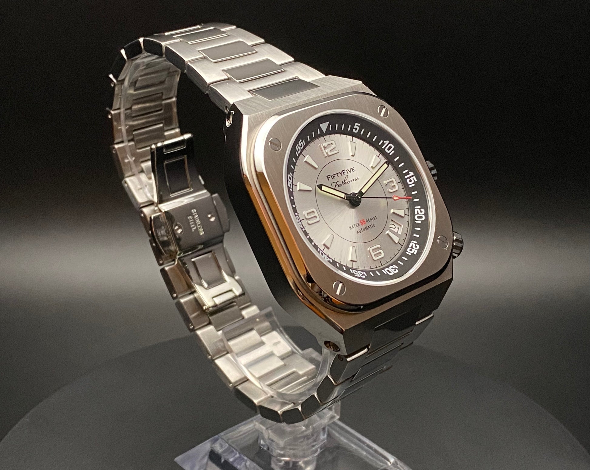 - Band: Integrated stainless steel with polished center links and brushed outer links.