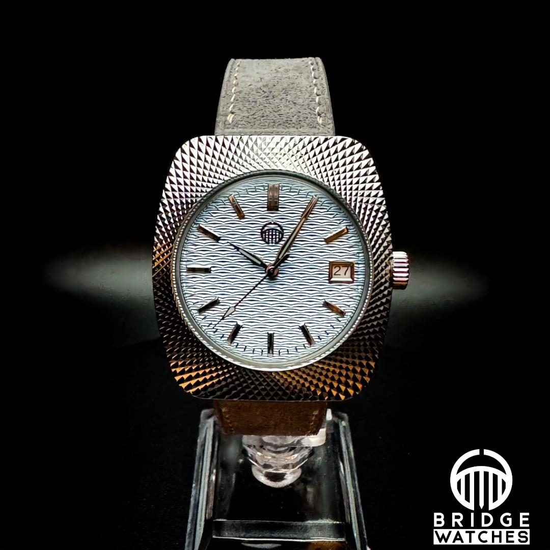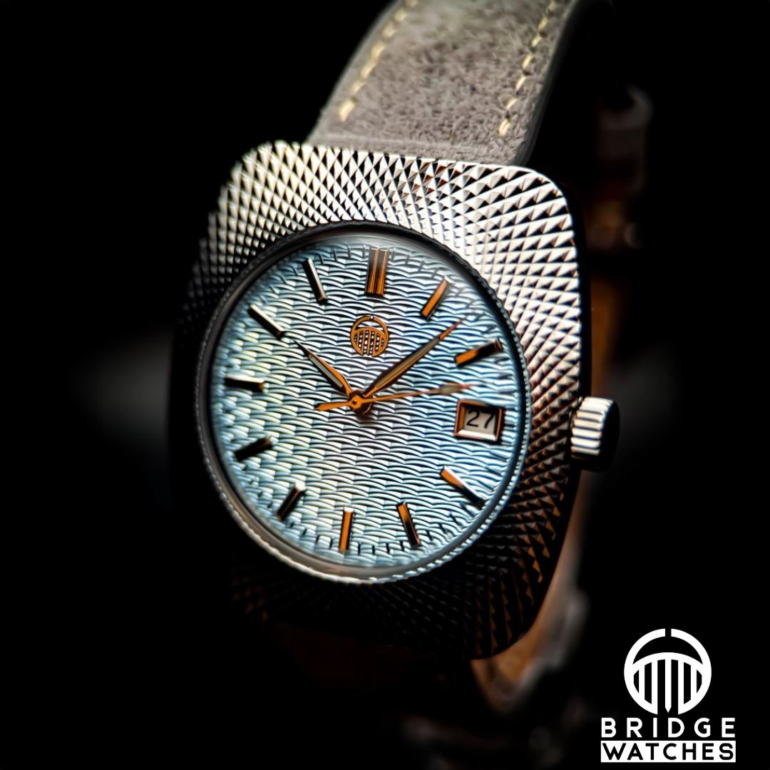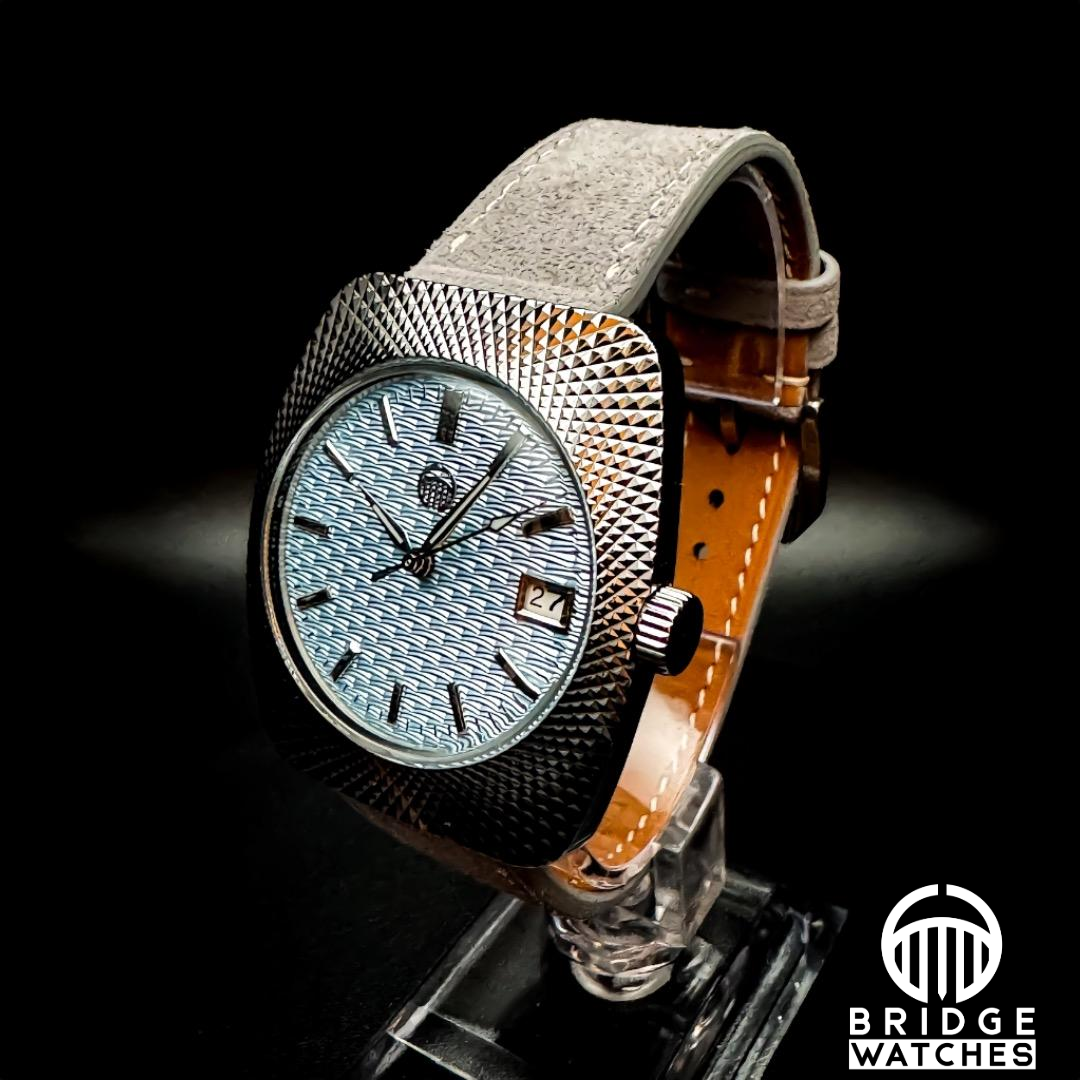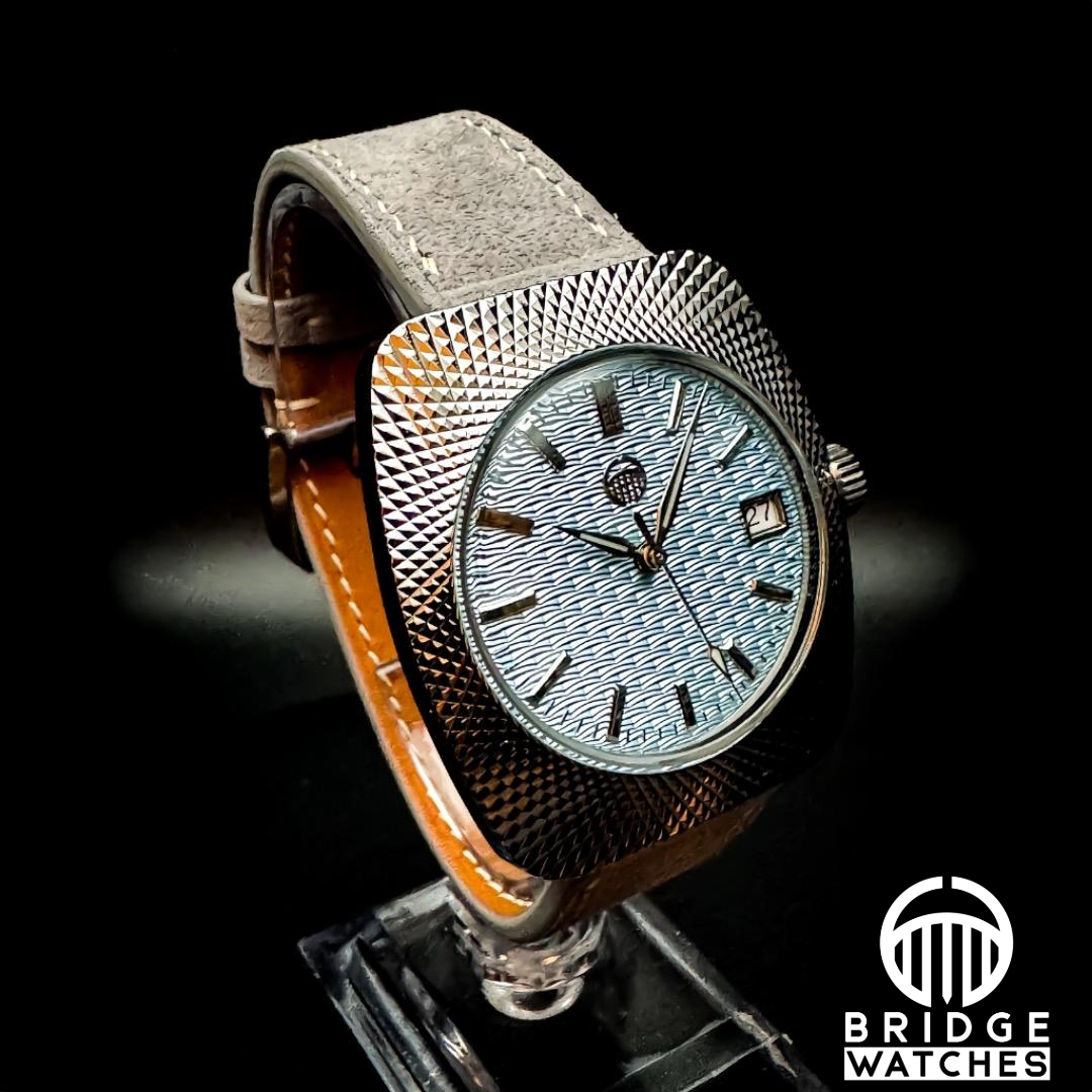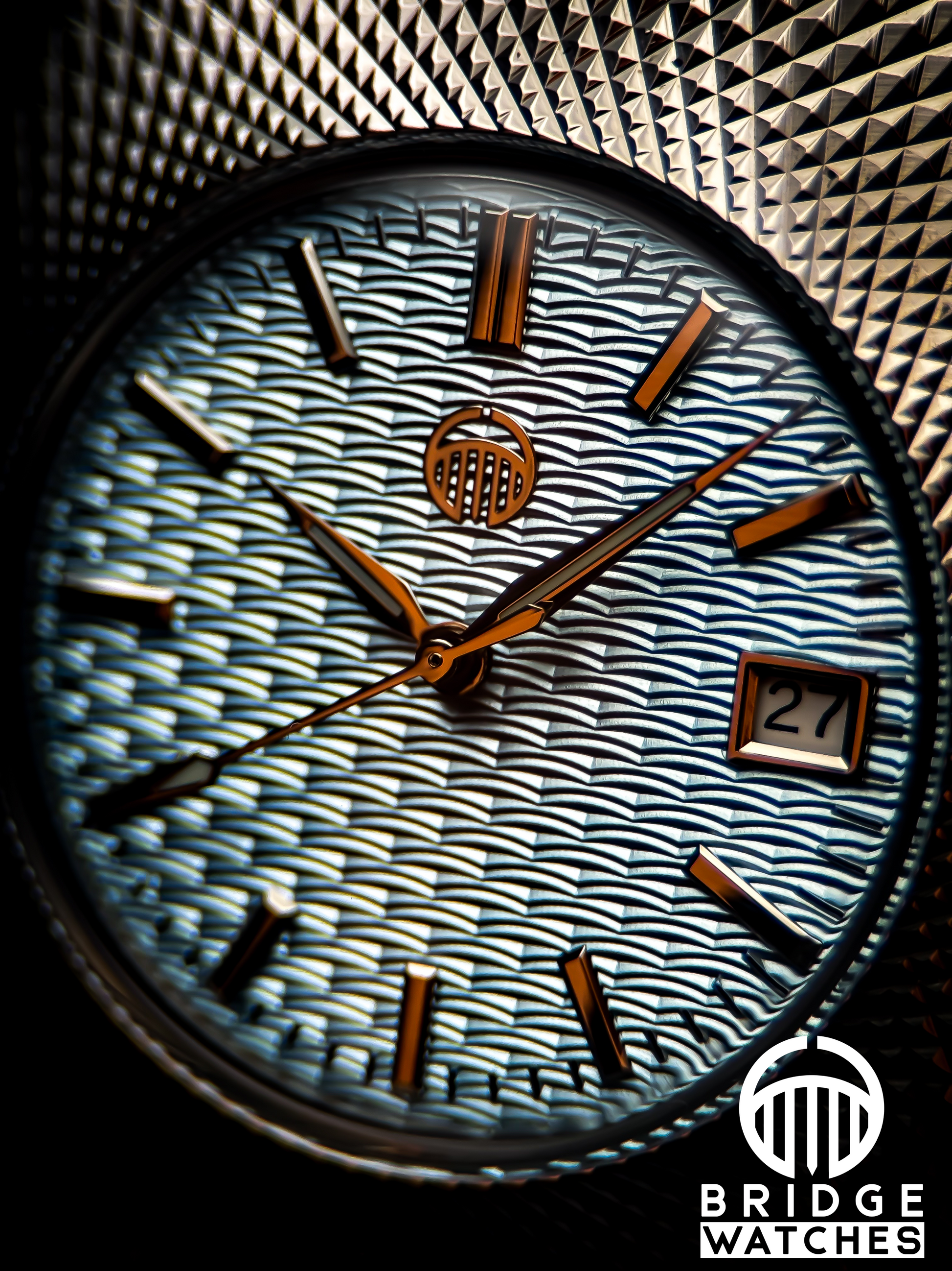- Dial: Ice blue with wave texture. Brushed and polished stick indices. No lume