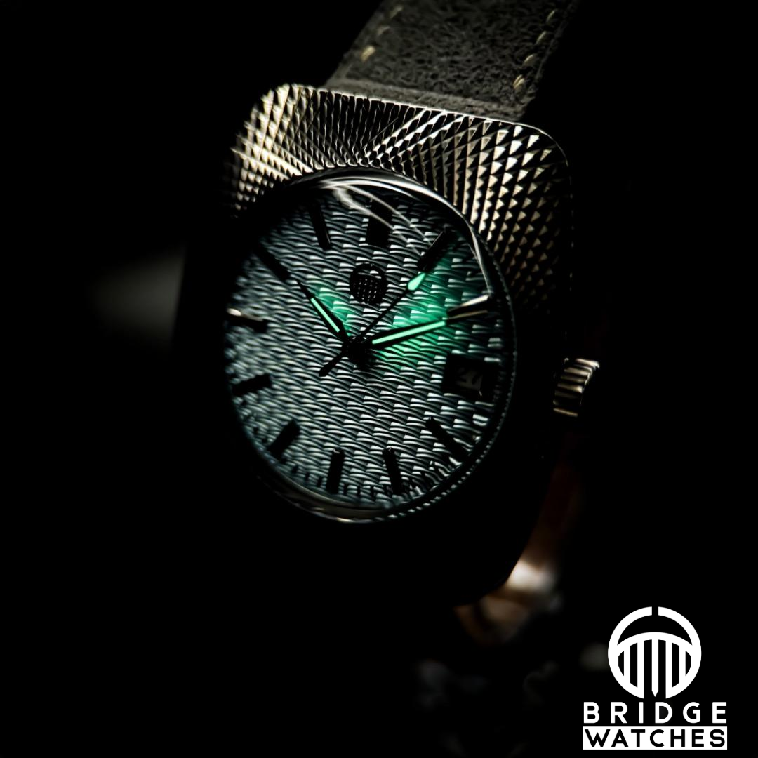 - Hands: Polished 316L stainless steel, leaf style with green lume