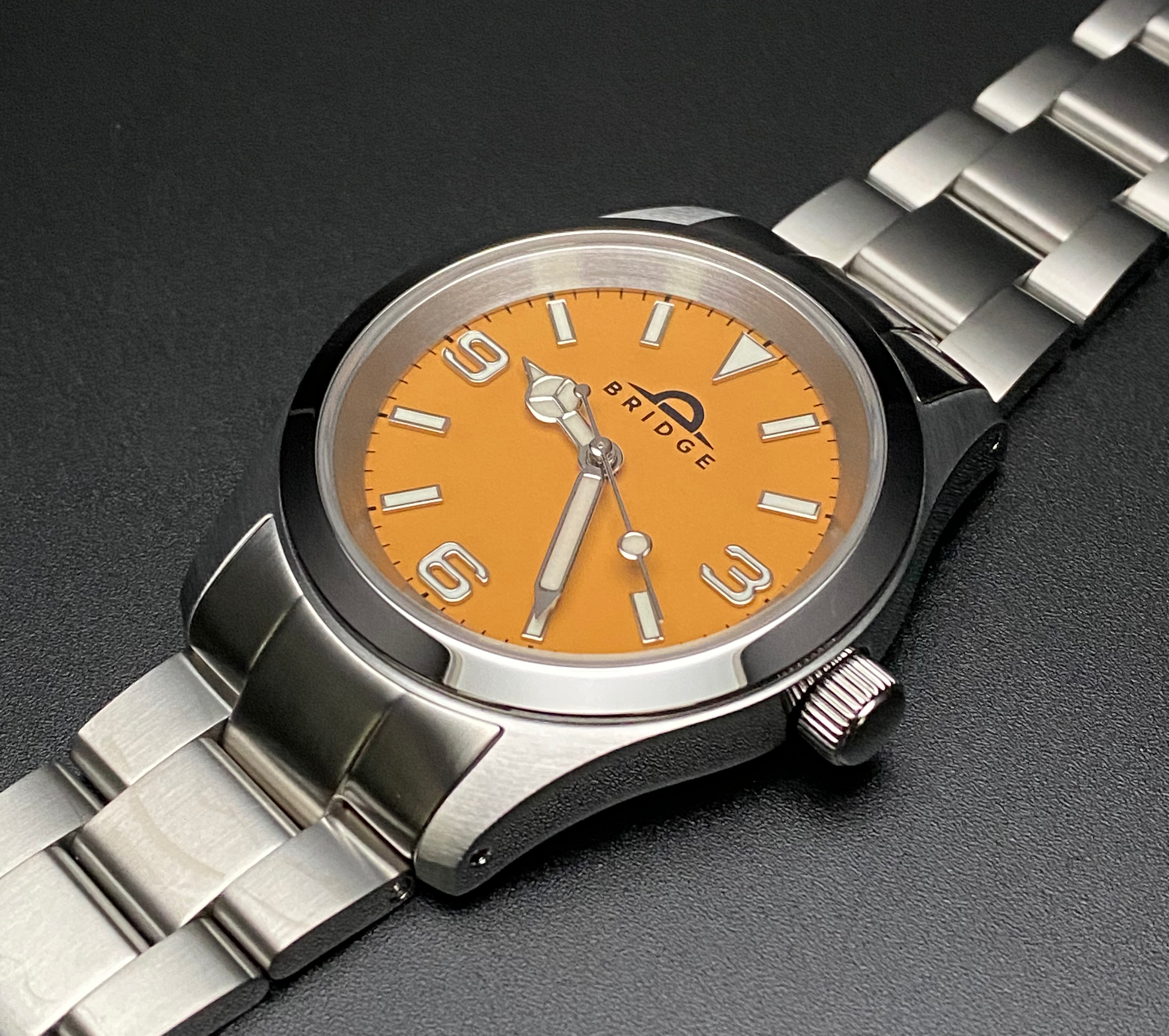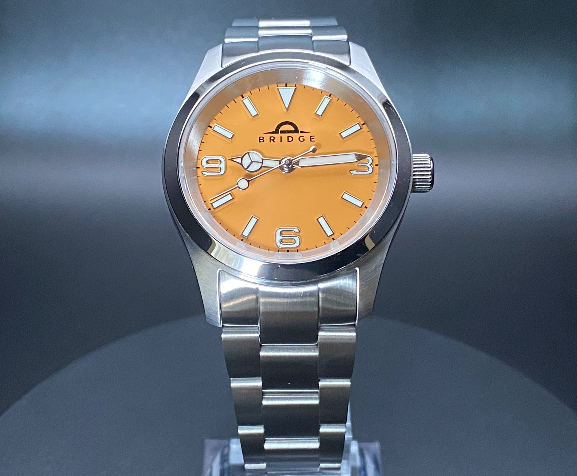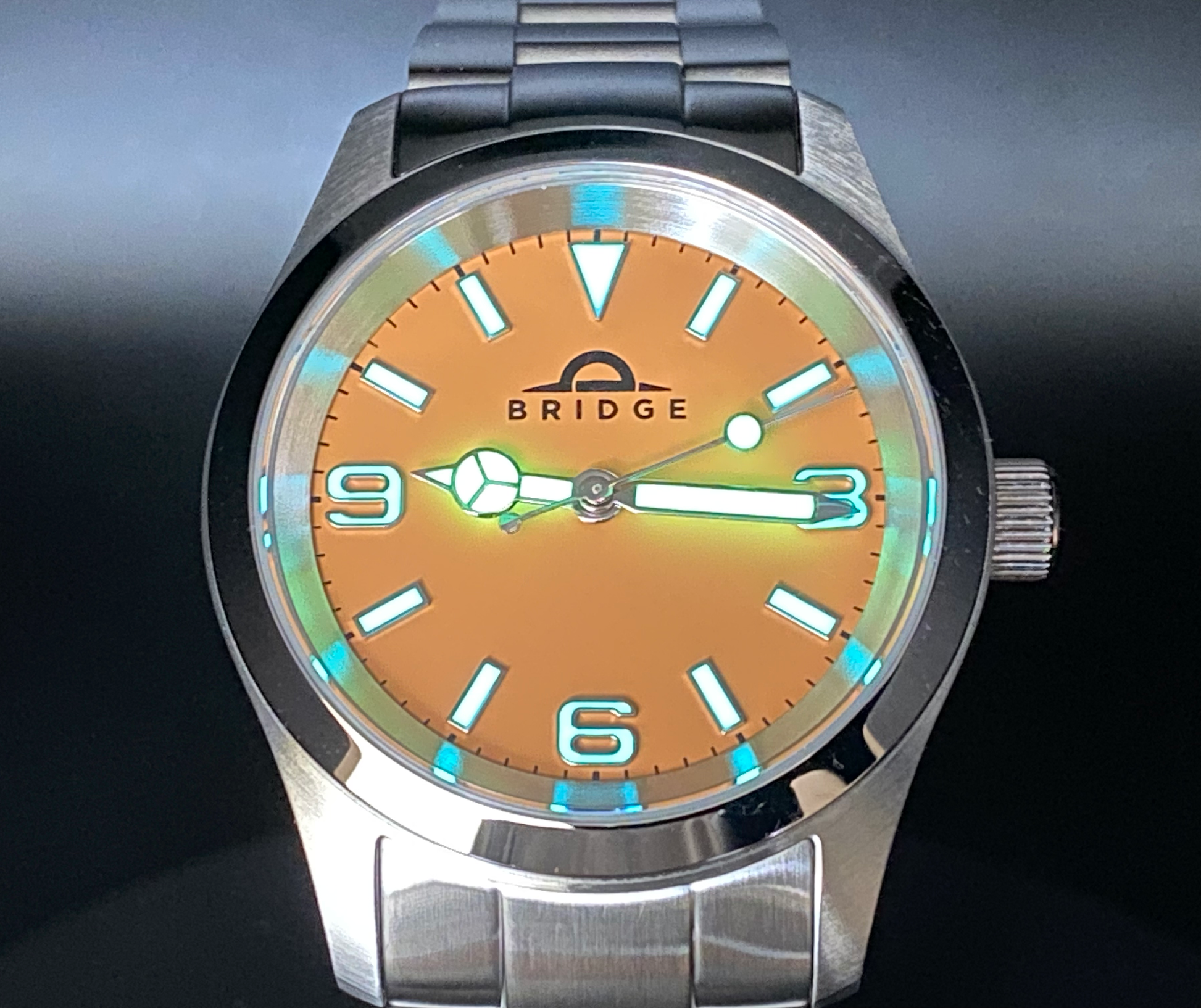 - Dial: Bridge Explorer in matte orange with blue-green lume