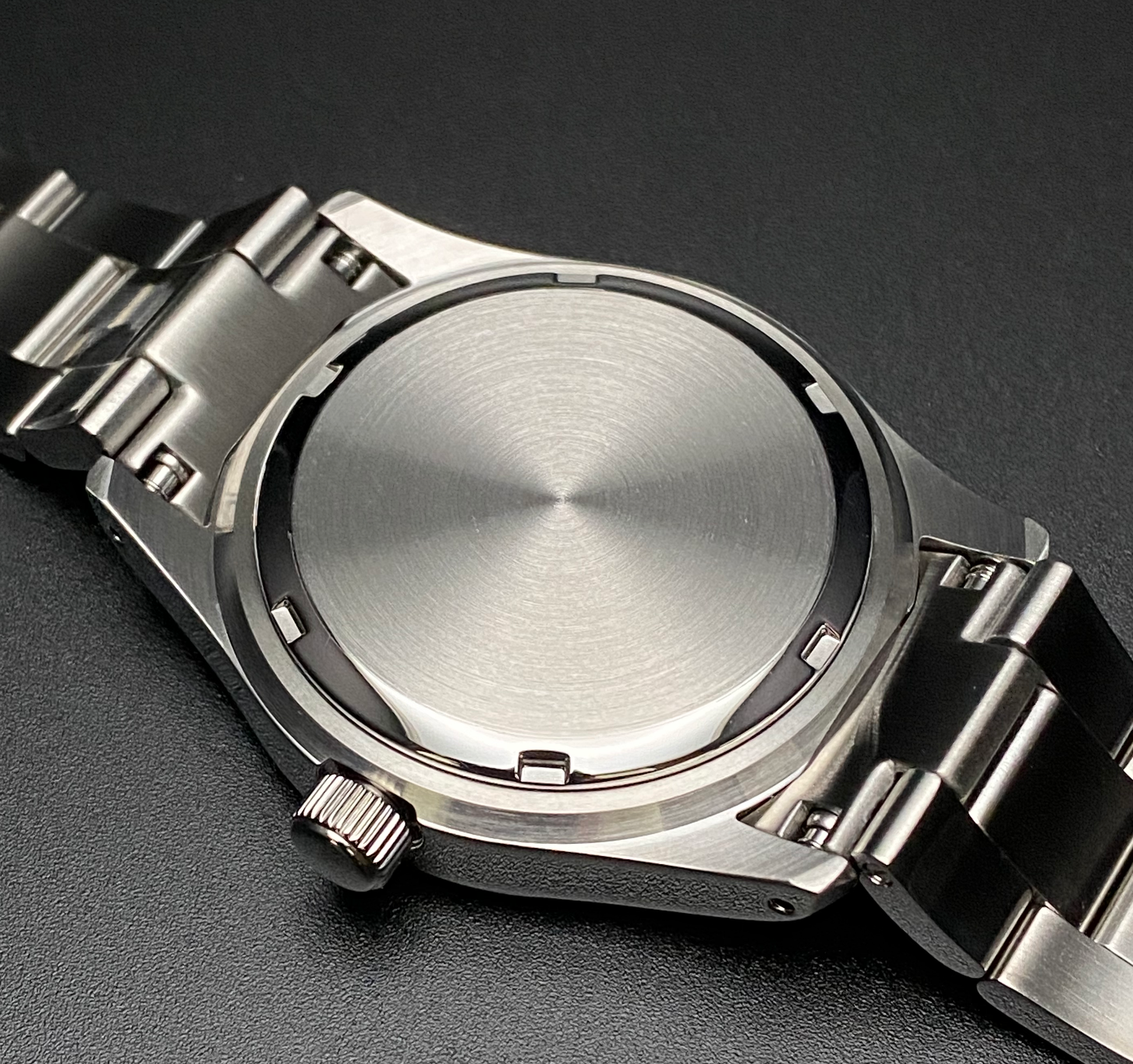 - Band: Brushed stainless steel Oyster-style