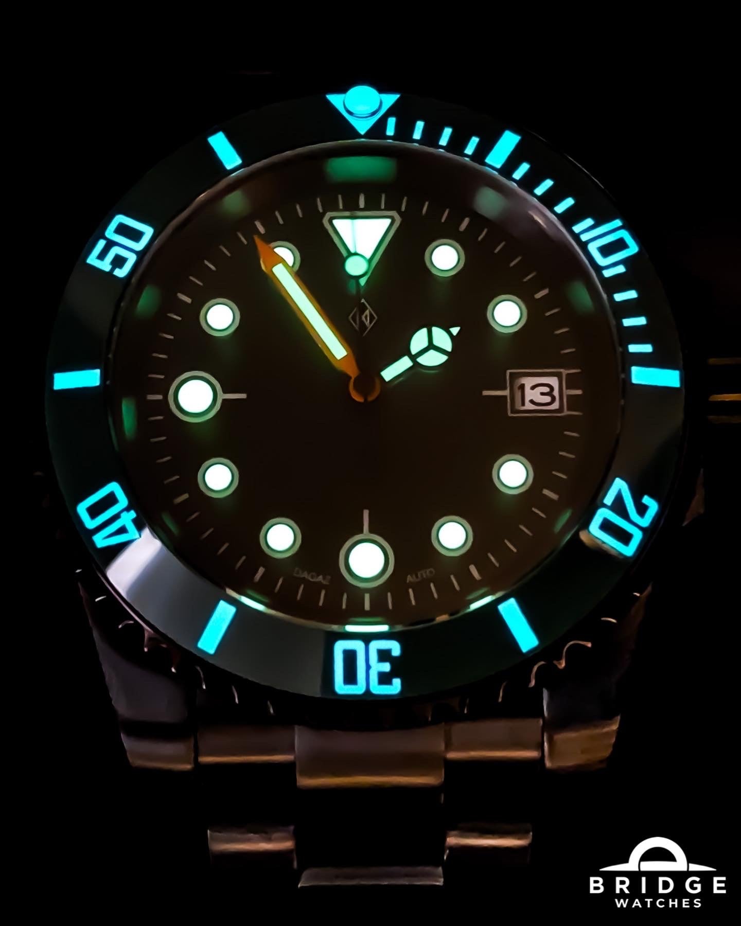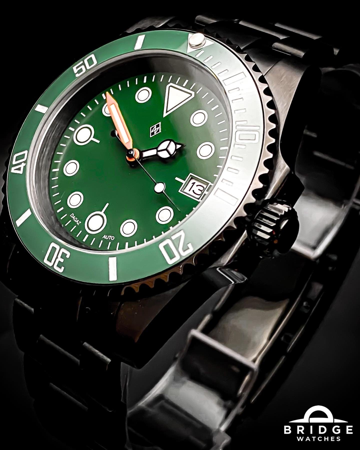- Dial: Green Heliox by Dagaz with white printed indices with custom Super-LumiNova C1 and C3 mixture and white minute track