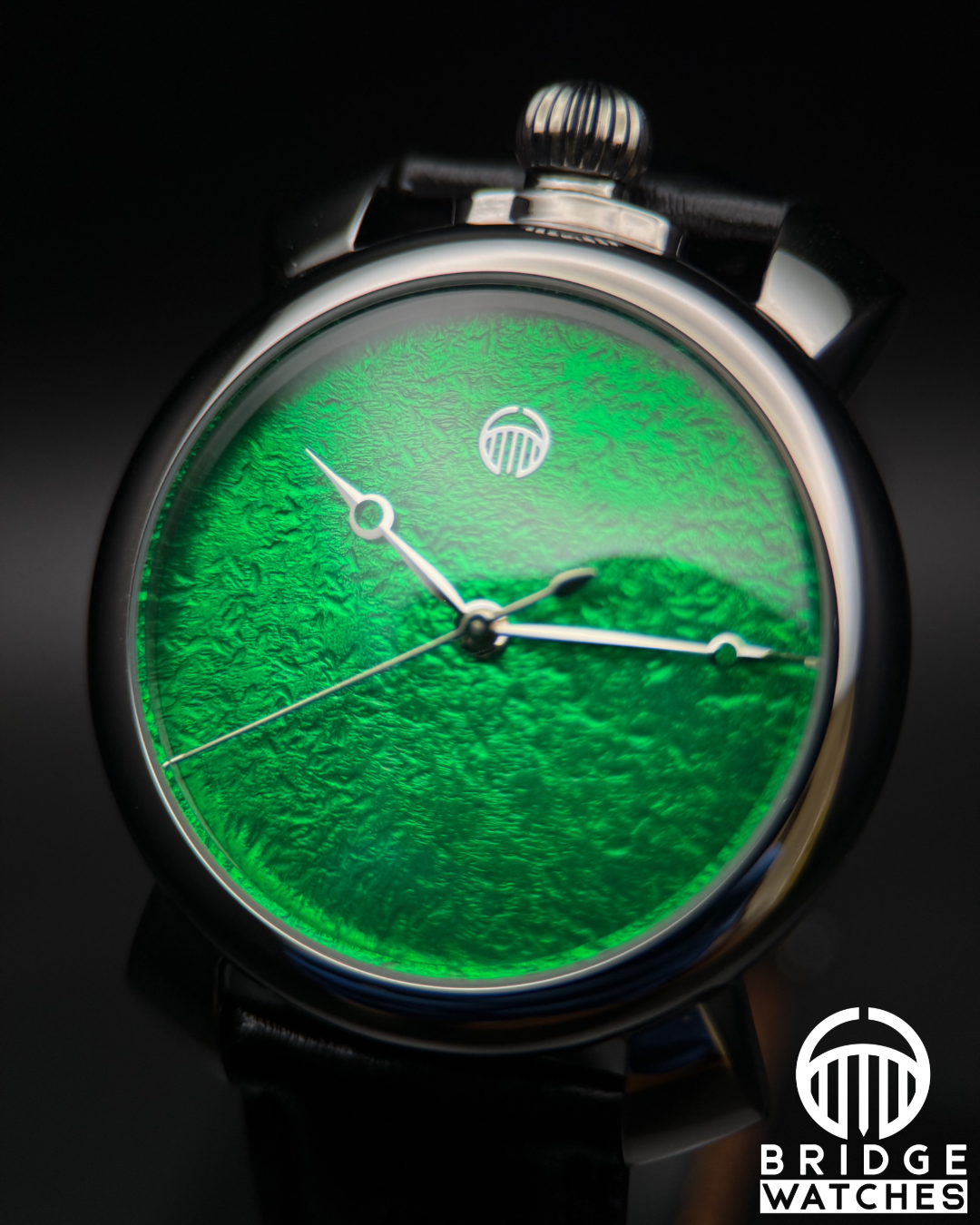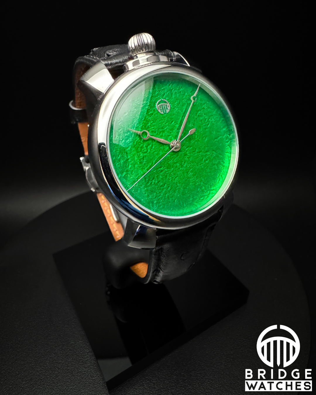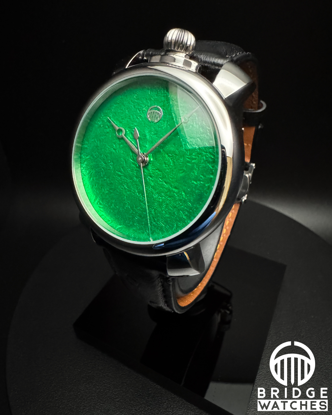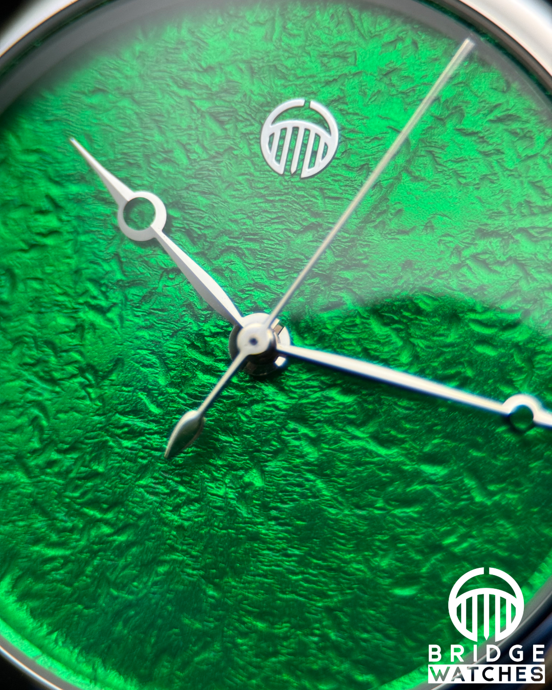 - Dial: Custom .925 sterling silver textured and airbrushed with applied logo