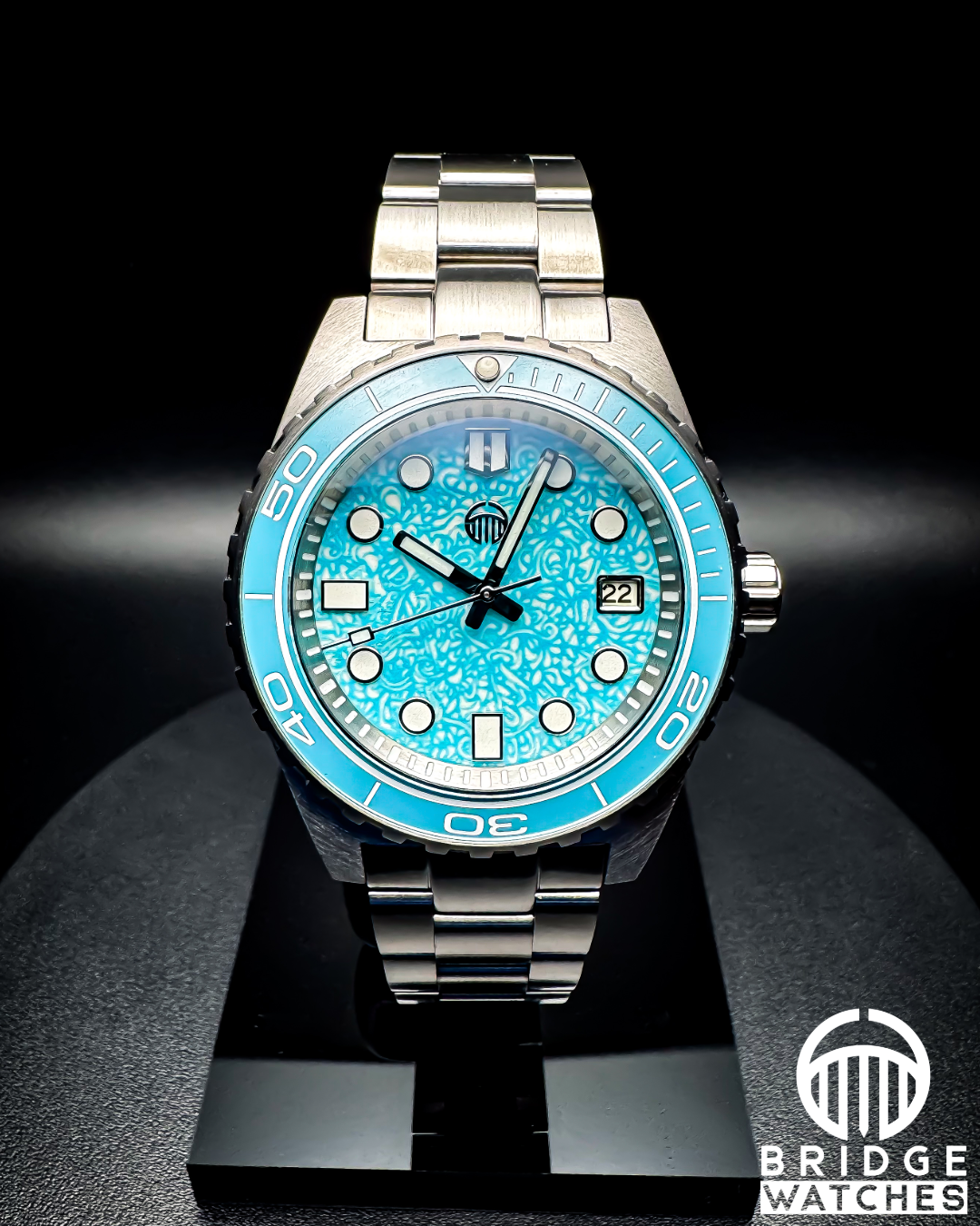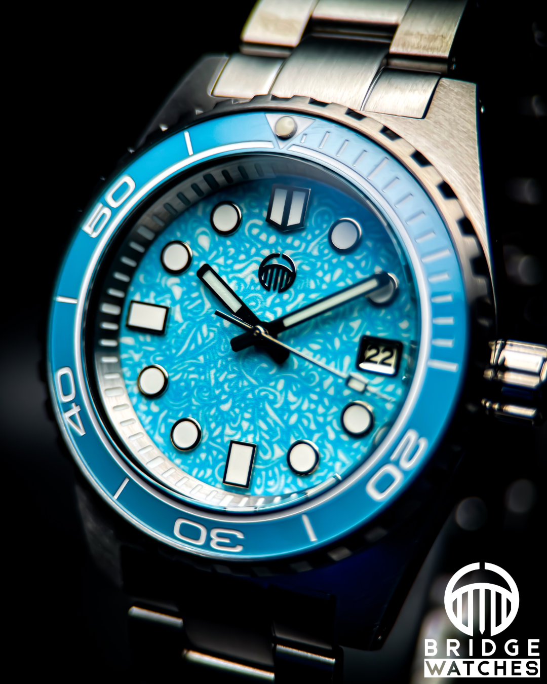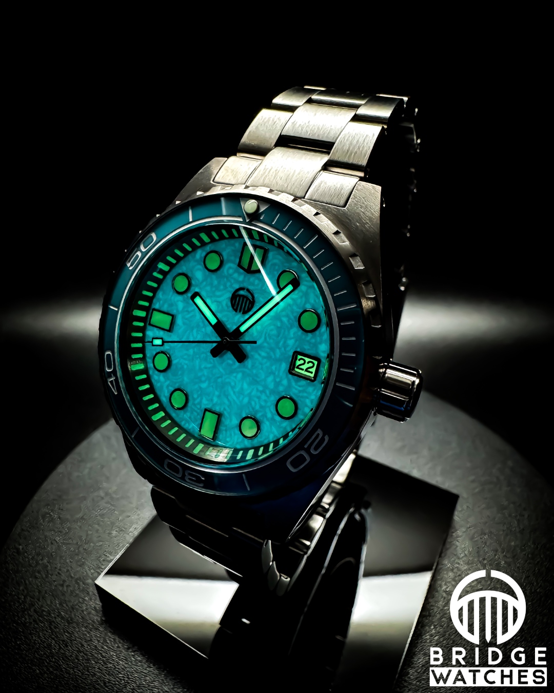 - Dial: Fully lumed light blue with polished silver indices, green and blue lume, and applied Bridge Watches logo