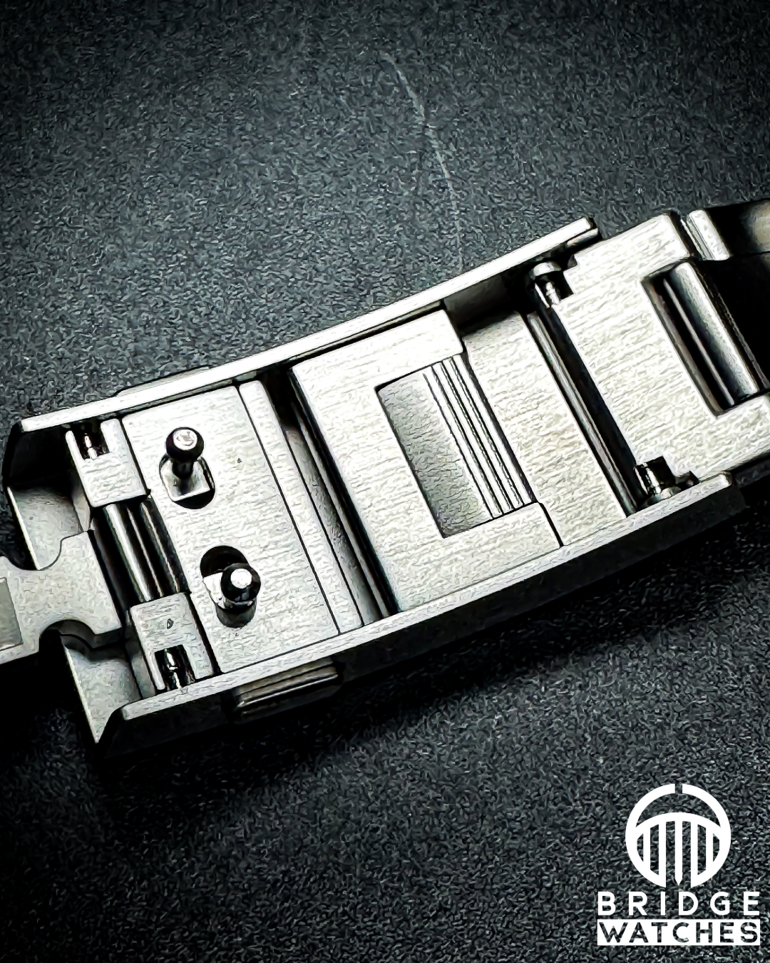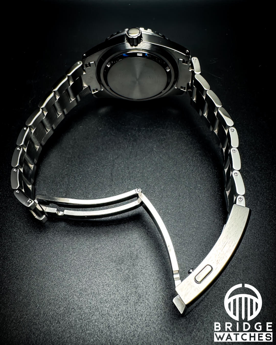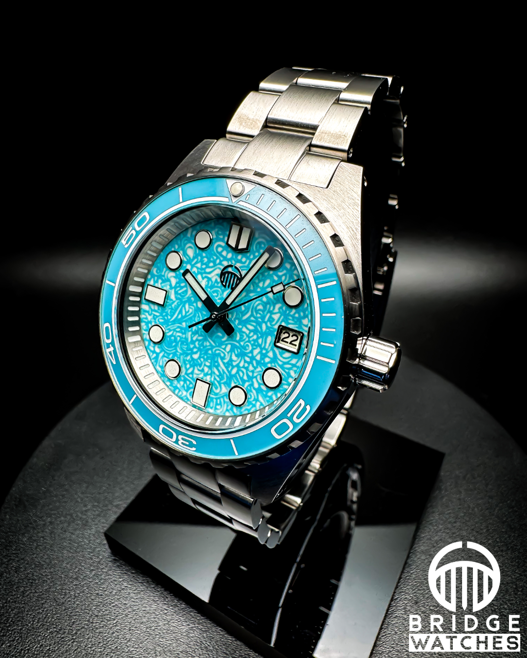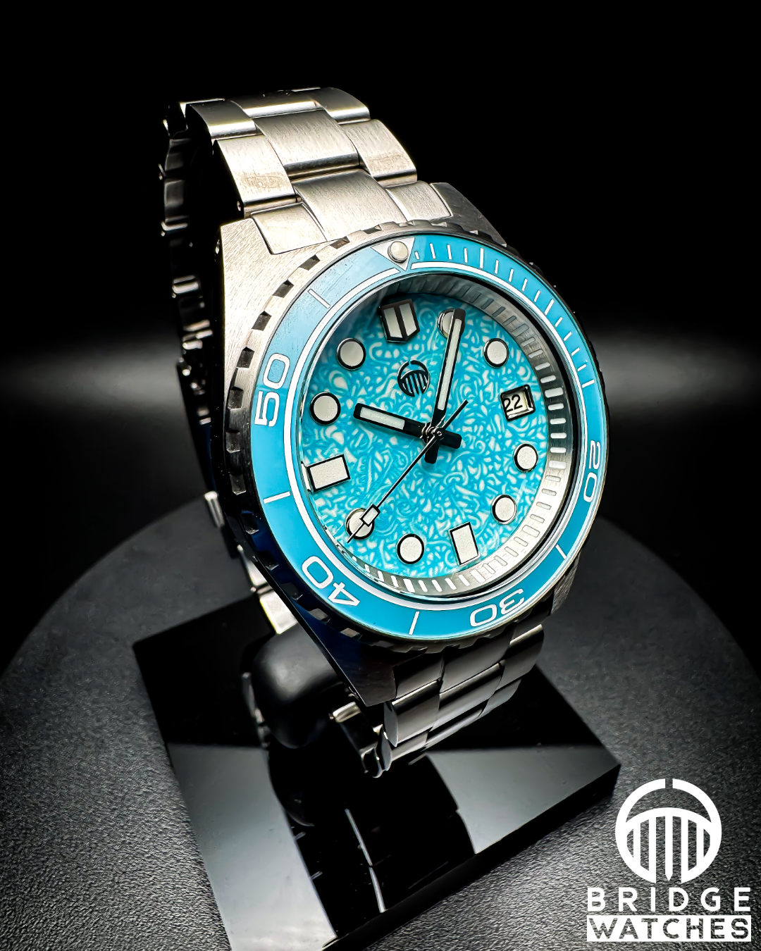- Dial: Fully lumed light blue with polished silver indices, green and blue lume, and applied Bridge Watches logo