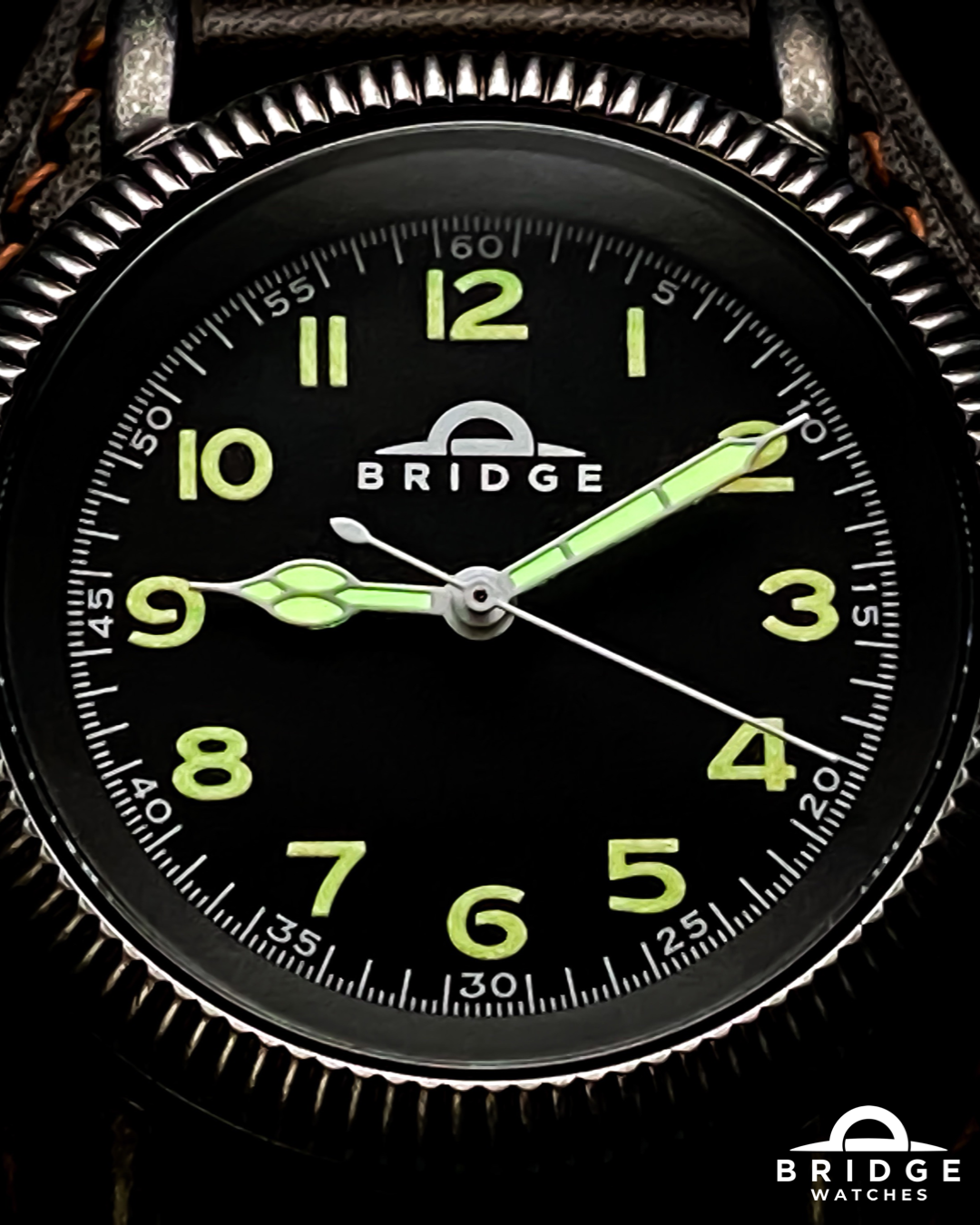 - Dial: Bridge Watches matte black field with orange vintage style painted Arabic indices and white minute track